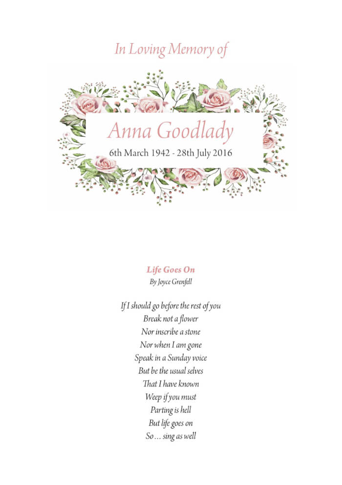Combining natural colours with elegance, our floral range of funeral order of service designs would be suitable for someone who loved their garden and the outdoors. Lillies, poppies and roses feature heavily on these timeless designs.